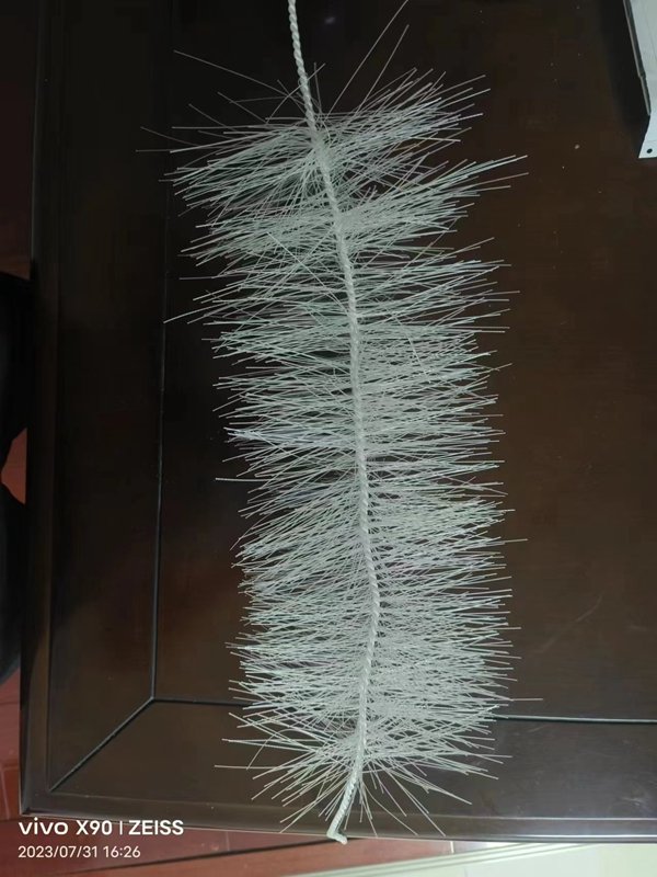 彈性填料篩選用聚烯烴類和聚酰胺中的幾種耐腐、耐溫、耐老化的品種,混合以親水、吸附、抗熱氧等助劑,采用特殊的拉絲、絲條制毛工藝,將絲條穿插同著在耐腐、強(qiáng)度高的中心繩上。由于選材和工藝配方精良,剛?cè)徇m度,使絲條呈立體均勻排列輻射狀態(tài),制成了懸掛式立體彈性填料的單體.填料在有效區(qū)域內(nèi)能立體均勻舒展?jié)M布,使氣、水、生物膜得到充分混滲接觸交換,生物膜不僅能均勻地著床在每一根絲條上,保持良好的活性和空隙可變性,而且能在運(yùn)行過(guò)程中獲得大的比表面積。